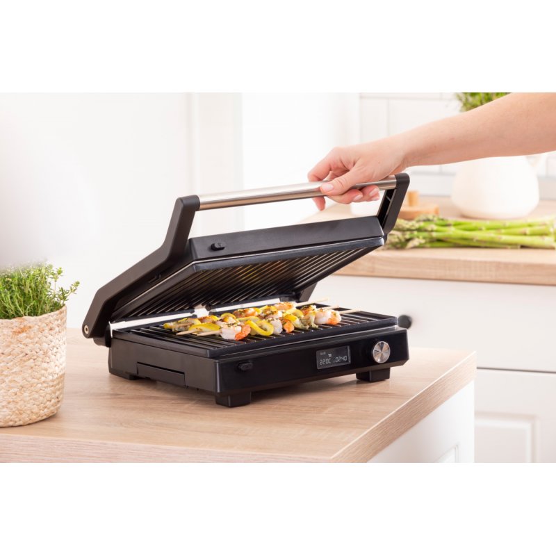 Этот гриль оснащен удобным регулятором с одной ручкой, что обеспечивает простое управление. Удобный светодиодный дисплей показывает температуру каждой пластины и позволяет удобно контролировать процесс. Наслаждайтесь грилем как профессионал.