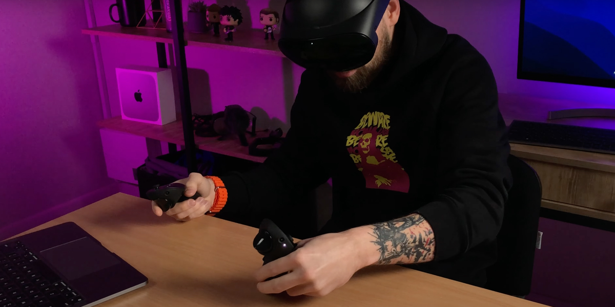 Держать контроллеры очень удобно и они на самом деле очень точно ориентируются в пространстве и даже распознают прикосновения. Датчики прикосновения есть и в кнопка и в джойстиках и курках, так что можно полностью понять где находятся твои пальцы. В главном меню еще ничего не нажимая - уже чувствуешь приятную виброотдачу, просто наводя на элементы меню и еще очень прикольно, что она срабатывает моментально.То есть синхронизация вибрации и контроллера, его ориентация в пространстве и то, что видно в самих очках - моментальна. Единственное, что можно добавить в геймпады сопротивление на кнопках, как в DualSense, и возможно такое появится в будущем.