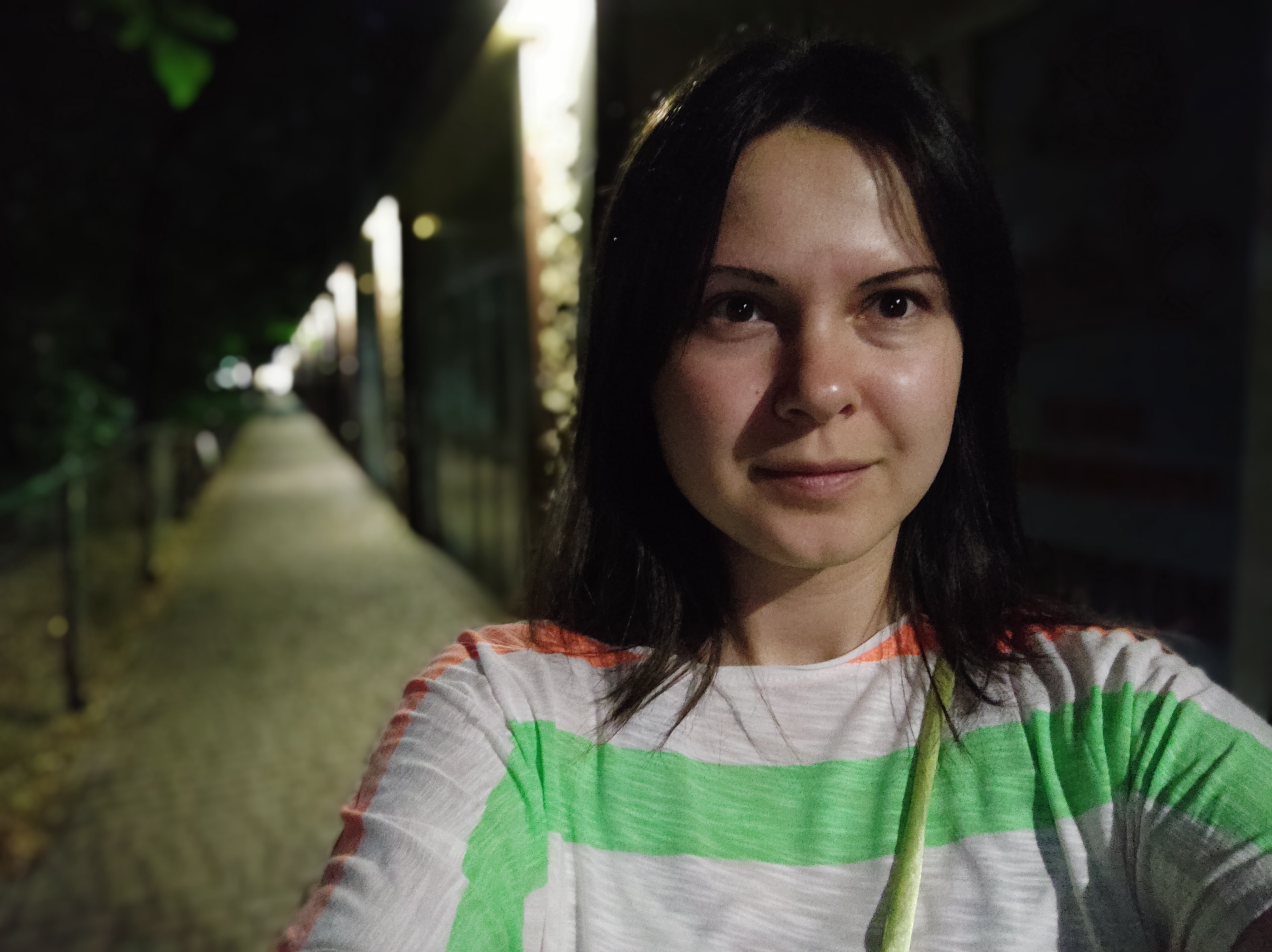 Есть режим “Ночь”. У фронтальной такого режима нет, поэтому как снимает ночью селфи камера проверила в портретном режиме.