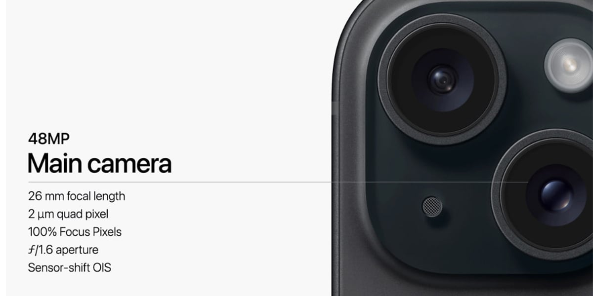 Основная камера iPhone 15 получила 48 Мп с диафрагмой f/1.6 и 12-мегапиксельный сверх широкоугольный телефото модуль. Благодаря новой 48-мегапиксельной матрице смартфон может делать кроп с полного кадра, что эквивалентно двукратному оптическому увеличению.