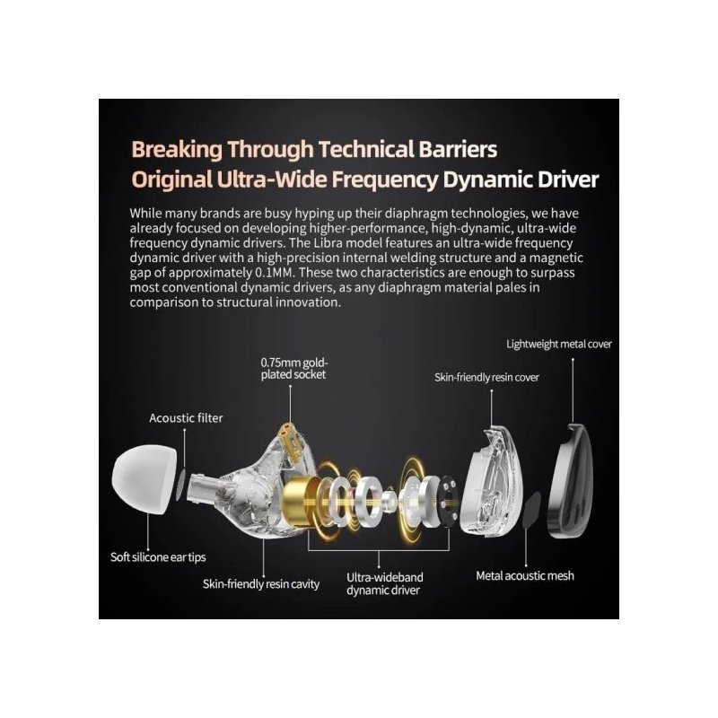 Високоточні акустичні характеристики: KZ Libra IEM вирізняється високоточною внутрішньою зварювальною структурою та магнітним зазором приблизно 0,1 мм у своєму надширокосмуговому динамічному драйвері. Ця ретельна конструкція забезпечує акустичну перевагу, що робить його конкурентоспроможним продуктом для тих, хто цінує справжню точність звуку. Підкреслення цих технічних особливостей сподобається аудіофілам, які шукають високоточні монітори-вкладиші.