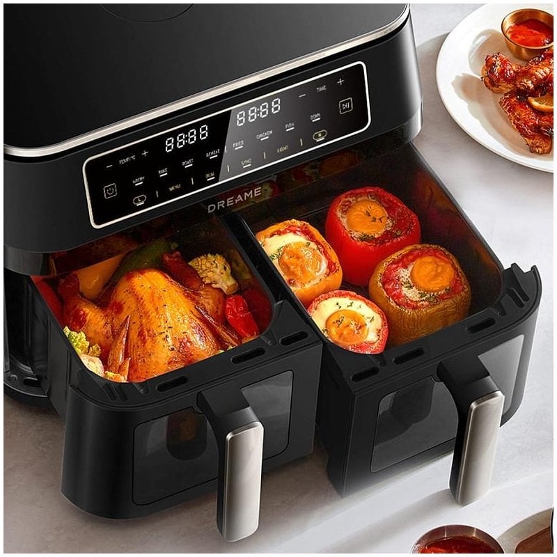Дві зони для приготування об'ємом 5.5л працюють незалежно, готуючи різні блюда одночасно. Запікайте цілу курку зліва і смажте картопля фрі праворуч. Одну ємність можна використовувати для вечері на вісім осіб, заощаджуючи час приготування та подвоюючи ефективність.